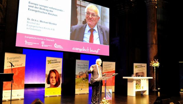 „Europa ist ein Zukunftsprojekt und keine Vergangenheit, die beschworen werden soll, wie die Fiktion eines ‚christlichen Abendlandes‘, einer Homogenität, die es in Europa so nie gegeben hat.“ Das sagte der lutherische Bischof und langjährige Generalsekretär derr GEKE, Michael Bünker, im Rahmen des Reformationsempfangs der österreichischen GEKE-Kirchen am Mittwoch, 24. Oktober, im Wiener Odeon-Theater. Bei dem Festakt anlässlich des Reformationstages am 31. Oktober plädierte Bünker für „mehr Europa, als wir heute haben.“ In seinem Festvortrag stellte der Bischof „angesichts aktueller Herausforderungen“ die Frage, „wie es weitergehen kann mit Europa. Kann der bisherige Weg einfach fortgesetzt werden? Wohl kaum!“ Für Bünker war es der letzte Reformationsempfang als amtierender Bischof, im kommenden Mai wählt die Synode eine Nachfolgerin oder einen Nachfolger.